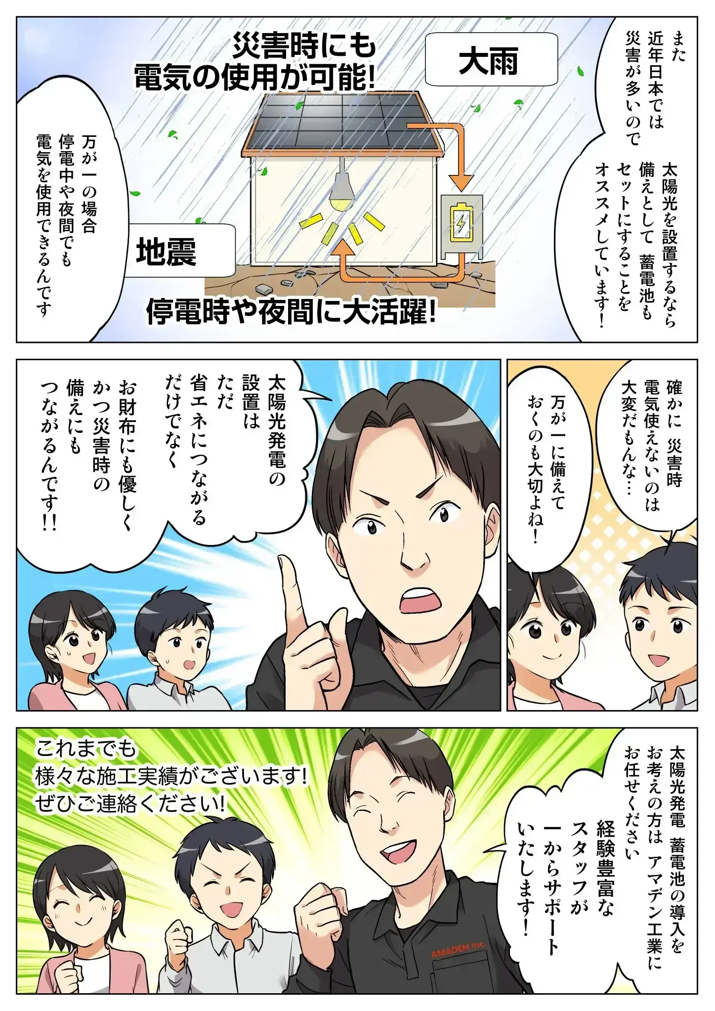 株式会社アマデン工業では、各種電気工事をはじめ、オール電化や太陽光発電まで幅広く対応しております。人柄のよいスタッフも在籍しており、ご要望なども話しやすい環境です。女性スタッフも在籍。お客様に寄り添った対応、丁寧かつ高品質な施工をお約束いたします。